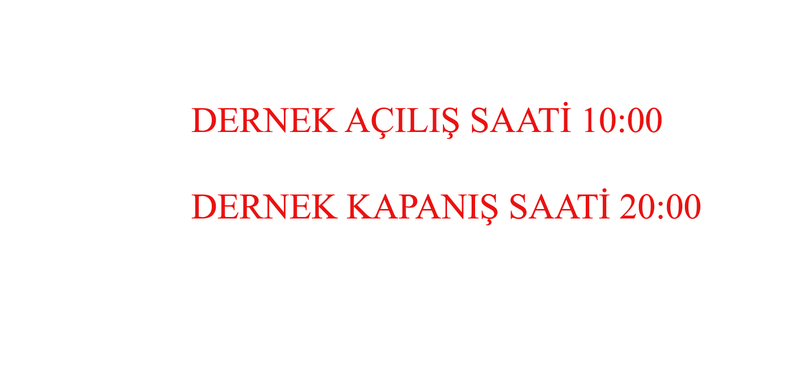 Dernek Açılış 10:00, Kapanış 20:00